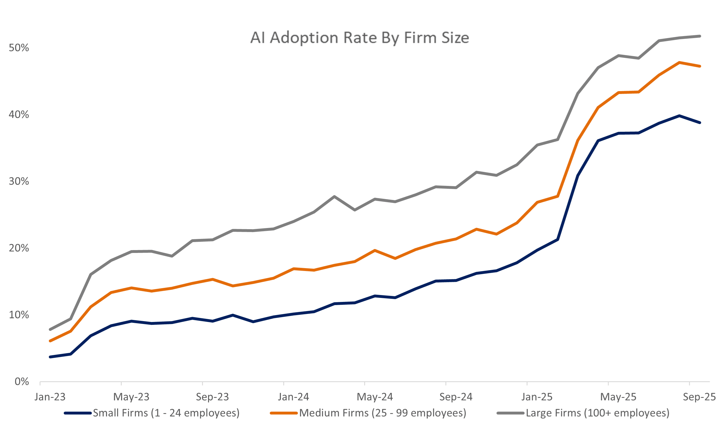 In recent months, small and medium-sized firms have slowed the pace of AI adoption, but probably not for long. In the months before the government shutdown, the corporate sector was developing the economic outlook. It’s possible the temporary concerns about growth and inflation put a damper on adoption rates, but as the tailwinds to growth reemerge, we should expect renewed interest in protecting margins, preparing for expansion, and managing headcount through greater AI adoption.