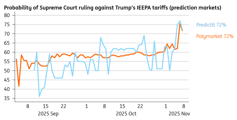 Sounds far-fetched? So did thoughts about the remodelling of the White House a year ago, so think on. The Supreme Court may have a 6-3 majority of Conservative judges, and three that were appointed by the current President himself. But the tone from many of them this week sounded sceptical. The ever-growing betting markets increasingly think Trump will lose; the latest pricing has a 72% chance of the justices upholding the lower courts’ verdict that the White House’s use of emergency powers for tariffs was illegal. Our team has a nice explainer on the whole thing here.