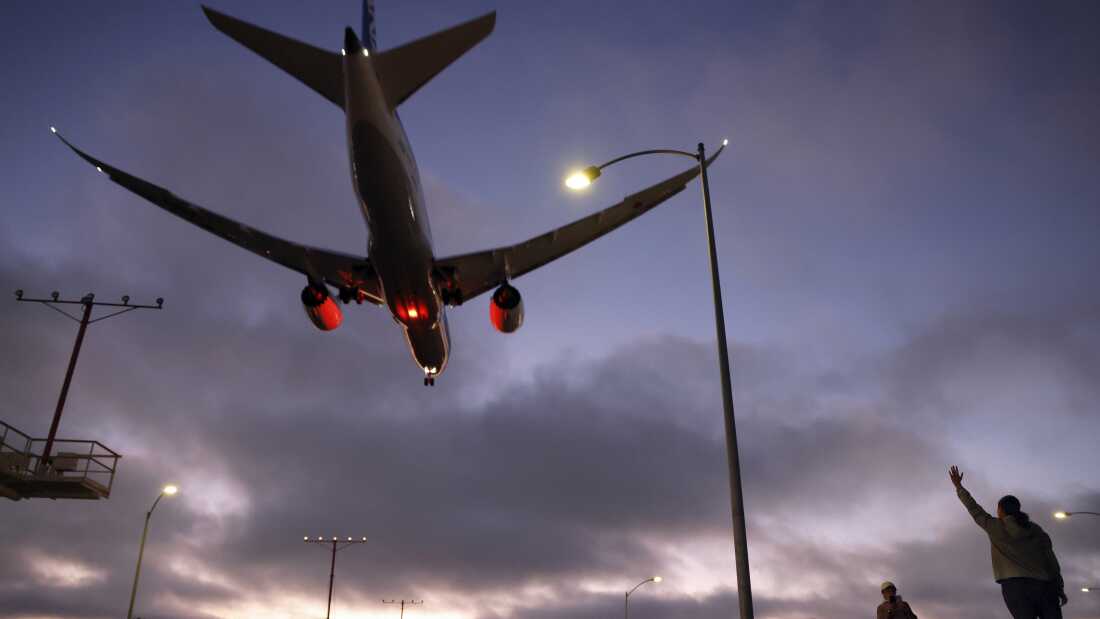 People take photos as a plane lands at Los Angeles International Airport (LAX) on Nov. 6, 2025, in Los Angeles, California. The FAA will be reducing flights by 10% in 40 major airports around the country, including LAX, beginning tomorrow amid air traffic control staffing shortages due to the federal government shutdown.