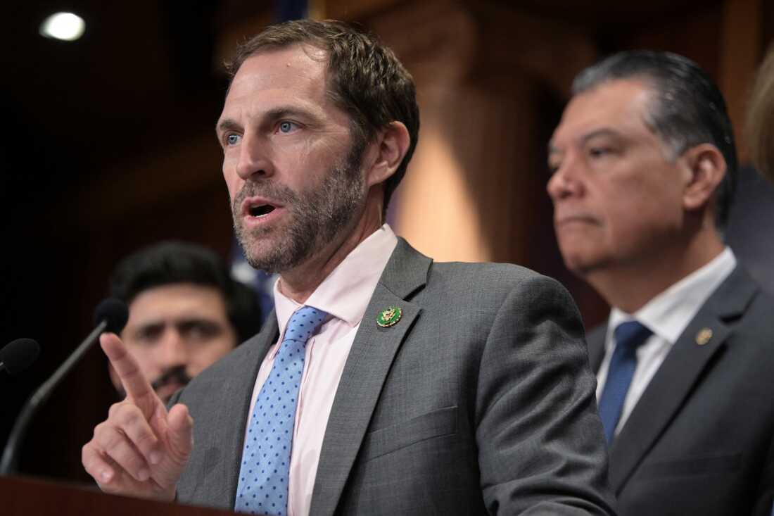 US Representative Jason Crow, Democrat from Colorado, speaks alongside Senator Alex Padilla (R), Democrat from California, during a news conference on free speech legislation, at the US Capitol in Washington, DC, on September 18, 2025.