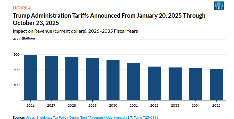Treasury bonds could see yields rise as the government faces a larger deficit, since tariff revenue, estimated at over $2 trillion over the next decade, will vanish. The graph below charts the federal tax revenues expected by the Urban-Brookings Tax Policy Center over the next ten years.