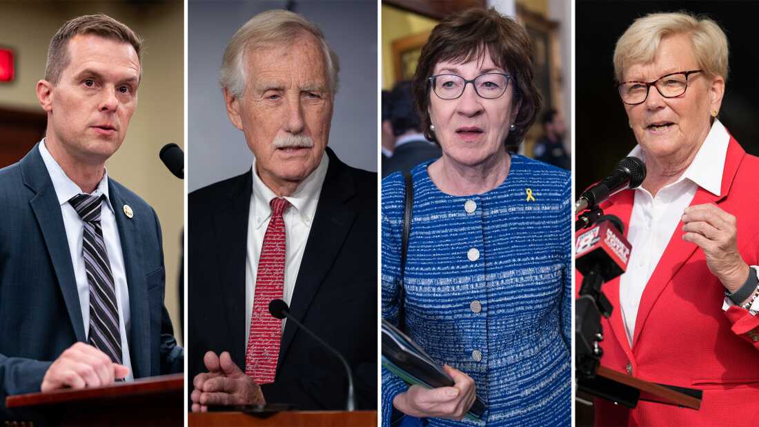 Maine’s congressional delegation is representative of varying political views on the vote to reopen the government. Seen here from left to right: Democratic Rep. Jared Golden in Washington, D.C., on July 17, Independent Sen. Angus King in Washington, D.C., on Nov. 9, Republican Sen. Susan Collins in Washington, D.C., on Oct. 7, and Democratic Rep. Chellie Pingree in Westbrook, Maine, on Oct. 4, 2024.